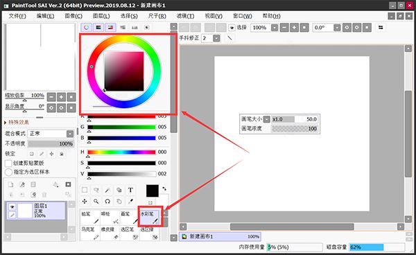 步驟六:選擇水彩筆,如下圖,對畫圖區(qū)域進(jìn)行處理(選擇R值為紅值,選擇紅色);