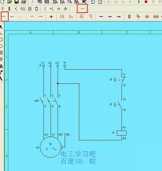 (1)交直流電源;(2)熔斷器和斷路器:(3)自動(dòng)開關(guān)和熱繼電器:(4)接觸器主觸頭;(5)交直流電機(jī);(6)電子元器件:(7)接觸器及繼電器輔助觸頭:(8)按鈕開關(guān);(9)接近開關(guān)及其他相關(guān);(10)線圈及輸出;(11)導(dǎo)線及電纜。該工具菜單使用的特點(diǎn)是:只要點(diǎn)擊任一工具菜單圖標(biāo),馬上在工具菜單下面一行顯示其類型工具條,方便大家選取合適的元件符號