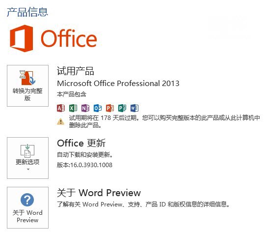 不過此中文版在版本信息上與英文版不同。英文版激活后會(huì)顯示“激活的產(chǎn)品”,而中文版會(huì)顯示為“試用產(chǎn)品”。另外,產(chǎn)品名稱也不相同。英文版會(huì)顯示為Office 2016專業(yè)版,而中文版顯示為Office 2013專業(yè)版(此 Microsoft Office Professional 2013 試用版將在 178 天內(nèi)過期)。微軟中國的開發(fā)部門還真懶,還寫著 2013,確實(shí)PP欠打。不過繼續(xù)看下面的具體版本號(hào)就會(huì)發(fā)現(xiàn),版本號(hào)的確為最新的16.0.3930.1008,而非Office 2013的15.X版。