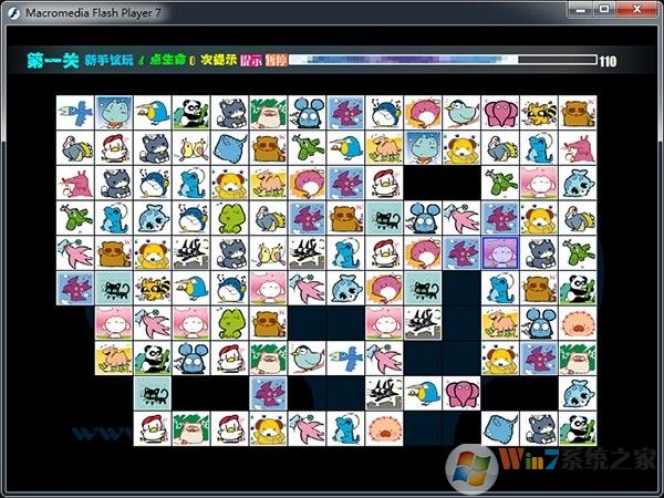 4、點(diǎn)擊開(kāi)始之后,就進(jìn)入連連看主界面了,在最上方有個(gè)時(shí)間的橫條,在不斷的減少,也就是玩游戲的總時(shí)間,在這個(gè)橫條消失之前要把游戲內(nèi)所有的寵物頭像消除干凈,消除不完就是失敗了。