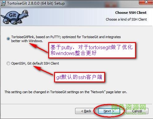 5.這里選openssh(git默認(rèn)的shh客戶(hù)端,位于git安裝目錄/bin/ssh.exe;如果配置了path,那直接是ssh.exe)和tortoisegitplink(位于tortoisegit安裝目錄/bin下)都可以,我們這里默認(rèn)第一個(gè),繼續(xù)“next”
