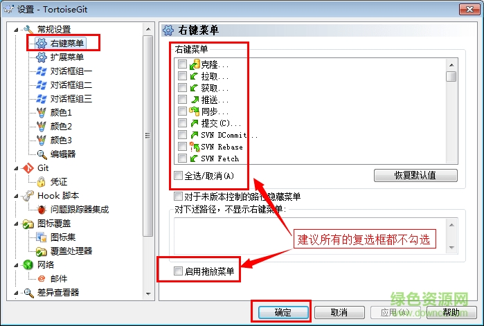 4.上面操作完成后,我們?cè)俅问髽?biāo)右鍵,可以看到菜單已經(jīng)變成中文了,“settings”變成了“設(shè)置”,“slone”變成了“克隆”;再次打開(kāi)配置菜單,選擇“右鍵菜單”,去掉所有的勾選(如圖),點(diǎn)擊“確定”