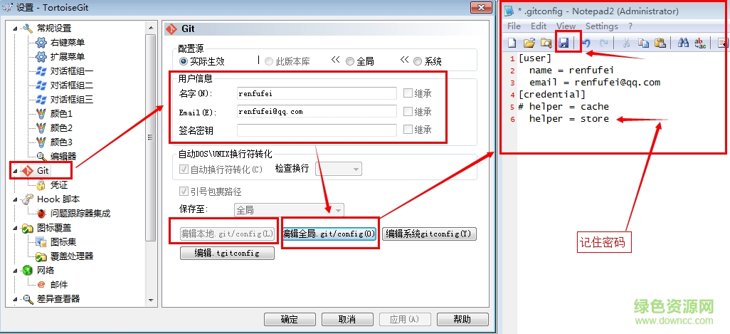 點(diǎn)擊 “編輯全局 .git/config(o)”按鈕,會(huì)使用記事本打開(kāi)全局配置文件,在全局配置文件中,在后面加上下面的內(nèi)容: