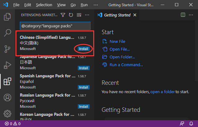 等待一會就安裝成功了,右下角會有“Would you like to change VS Code’s UI language to Chinese Simplified and restart?”的提示,詢問你是否切換成中文,選擇下面的“Change Language and Restart”
