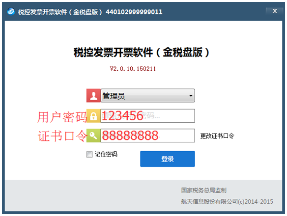 啟動開票軟件后出現(xiàn)以下界面,首次安裝時用戶密碼默認為123456,證書口令默認為88888888,輸入完整后點擊登錄。