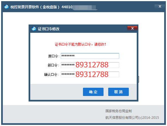 此口令設(shè)置后不建議修改,在累計連續(xù)5次錯誤后,證書將會鎖死導(dǎo)致無法開票;