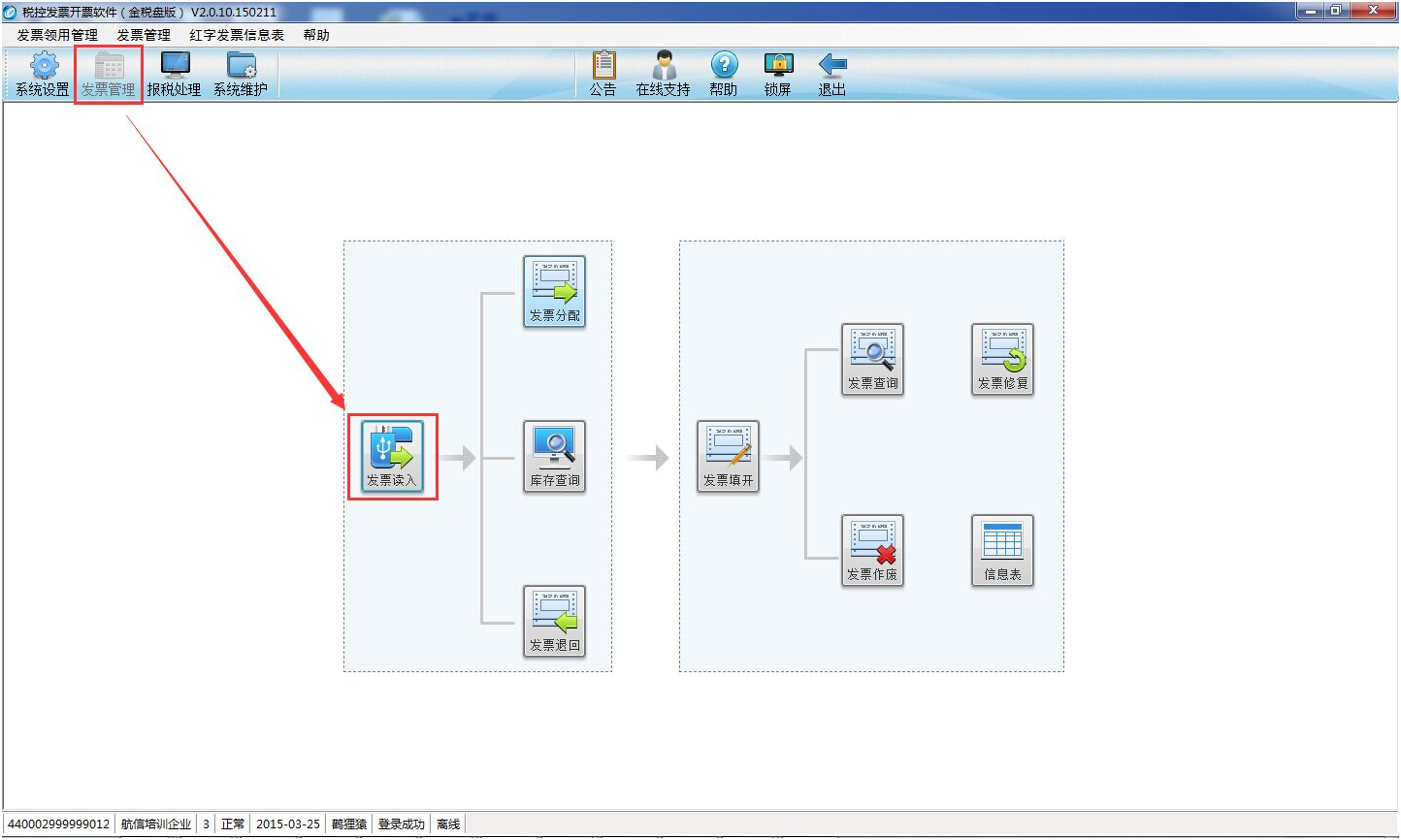 遷移數(shù)據(jù)后打開“發(fā)票管理”界面點擊“發(fā)票讀入”讀入剩余空白發(fā)票