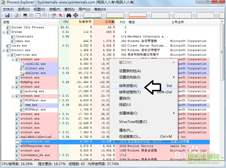 6.若電腦很卡,可以使用Process Explorer查看正在運(yùn)行的程序,結(jié)束進(jìn)程即可,如winwin7分享的圖片所示: