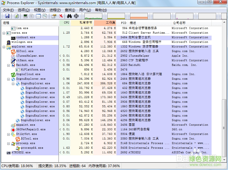 1.打開Process Explorer軟件,可以看到電腦運(yùn)行的所有的程序了,還可以看到電腦內(nèi)存和CPU的使用情況,如winwin7分享的圖片所示: