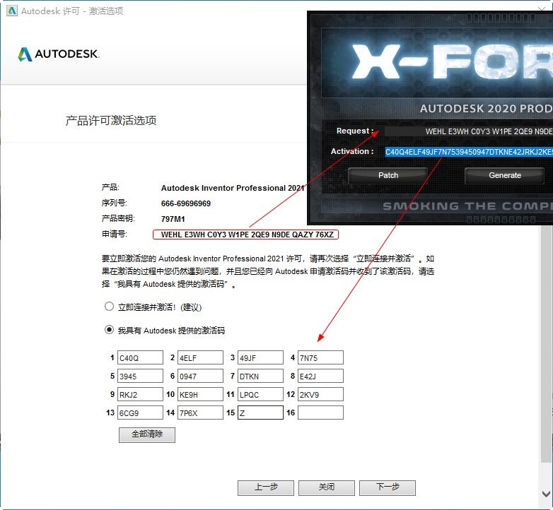 8、以管理員身份運(yùn)行注冊(cè)機(jī),將申請(qǐng)?zhí)枏?fù)制到注冊(cè)機(jī),點(diǎn)擊pathc,點(diǎn)擊generate,生成激活碼,將激活碼復(fù)制到軟件激活頁面,點(diǎn)擊下一步,如winwin7分享的圖片: