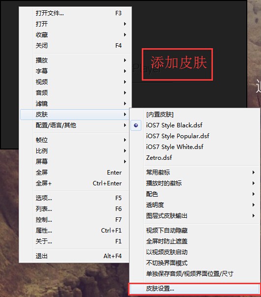 打開播放器,右鍵找到皮膚選項,點擊皮膚設(shè)置,如winwin7分享的圖片: