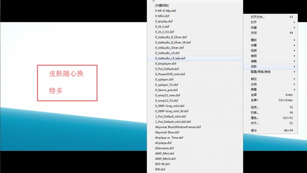 播放器皮膚的更改:右擊播放器窗口,在彈出的擴(kuò)展菜單中選擇“皮膚”項,就可以從其擴(kuò)展面板中使用其它皮膚啦,如winwin7分享的圖片: