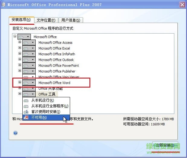 3.在“安裝選項(xiàng)”這里去掉office其他組件,只留word2007(如圖框起來(lái)的地方)。如果你還需要其他組件也可以選擇一起安裝。