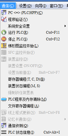 6、編譯完成后,依次點(diǎn)擊菜單中的“通信--PC<=>PLC”,確定后將程序下載到PLC中,就可以進(jìn)行調(diào)試了。