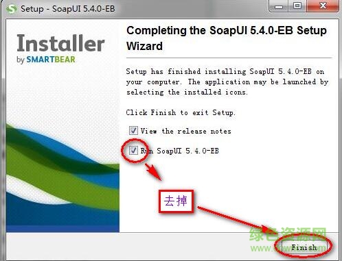 7.剩下的一直默認(rèn),下一步即可,直到看到下圖的界面,去掉“run soapui 5.4.0-eb”,不要立即運(yùn)行,點(diǎn)“finish”結(jié)束