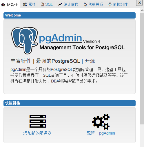 緊接著重啟軟件,pgAdmin4的界面已經(jīng)變成中文,如winwin7分享的圖片: