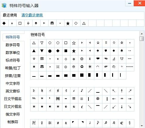 左側(cè)標(biāo)簽選擇種類,右側(cè)滑輪下拉菜單。找到你想要的特輸符號(hào)單擊即可輸入