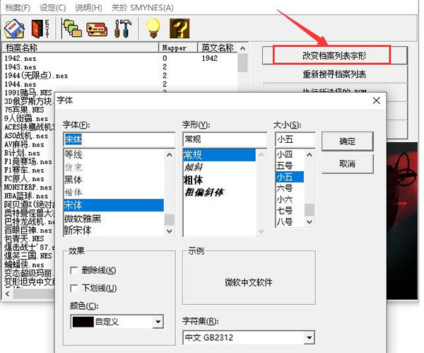 接下來(lái)可以看到小霸王模擬器界面右側(cè)有“改變檔案列表字形”選型,點(diǎn)擊后就可以進(jìn)入字體選項(xiàng)界面,如圖所示,可以設(shè)置字體種類、字形、大小等選項(xiàng),設(shè)置完成后進(jìn)行下一 步;