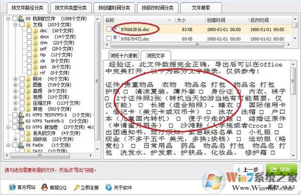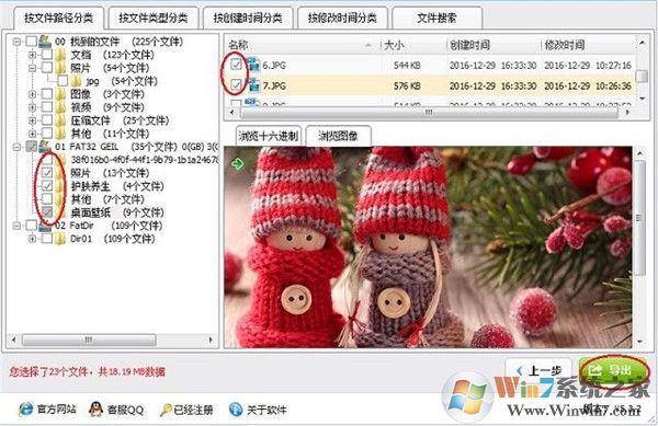 5、如果找到您要恢復(fù)的文件,可以在樹形控件和列表控件里勾選您需要恢復(fù)的文件和目錄。然后點(diǎn)擊“導(dǎo)出”按鈕,導(dǎo)出數(shù)據(jù)。