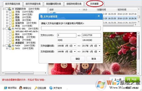 如果您找到的文件太多,或只需要恢復(fù)特定格式、名稱的文件,或需要恢復(fù)指定大小的文件,或需要恢復(fù)某段時間創(chuàng)建、修改的文件,請點(diǎn)擊"文件搜索"按鈕,在彈出的“文件過濾設(shè)置”對話框中設(shè)定條件過濾文件。