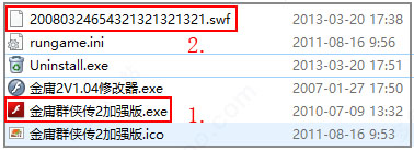 金庸群俠傳2加強版內(nèi)有游戲的2種格式,一種是已經(jīng)打包好的游戲“金庸群俠傳2加強版.exe”,只要雙擊啟動就可以玩了,另外一種是swf的flash文件“20080324654321321321321.swf”,這個需要flash播放器或者是用瀏覽器打開,不過這個swf的文件可用修改器第一個就不行。