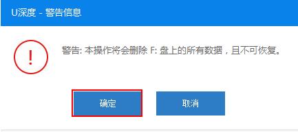 這時會出現(xiàn)一個彈窗警告:“本操作將會刪除所有數(shù)據(jù),且不可恢復(fù)”,若u盤中存有重要資料,可將資料備份至本地磁盤中,確認備份完成或者沒有重要資料后我們點擊“確定”執(zhí)行制作,如圖所示: