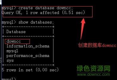 3.create database downcc;創(chuàng)建一個名字是downcc的數(shù)據(jù)庫,再輸入show databases;可以看到downcc我們創(chuàng)建的數(shù)據(jù)庫(如圖),可以正常使用,如winwin7分享的圖片: