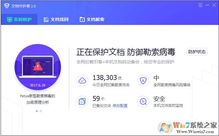專業(yè)應(yīng)對勒索病毒,全網(wǎng)攔截引擎可自動攔截超過400種勒索病毒,本機(jī)文檔自動備份功能,中招也可快速找回被加密文檔,省心!