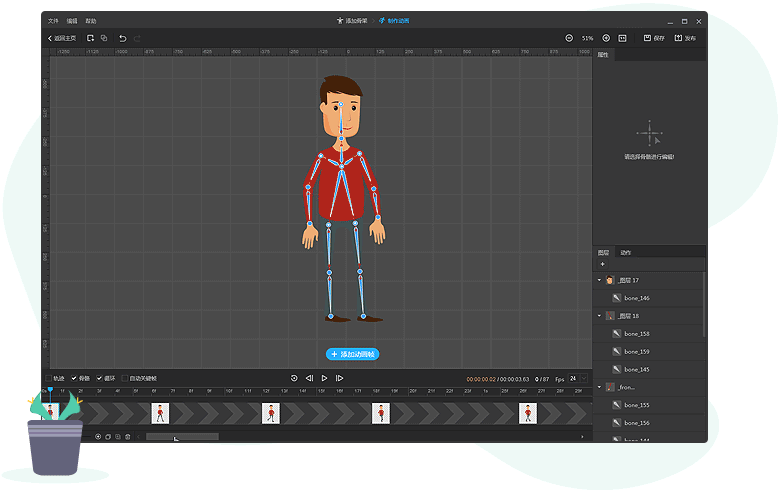輕輕松松導(dǎo)進(jìn)好幾張圖片,迅速加上骨骼到圖片中,運(yùn)用骨骼操縱好幾張圖片的不同的姿勢(shì)與姿勢(shì),作出融洽且豐富多樣的角色動(dòng)畫(huà)。
