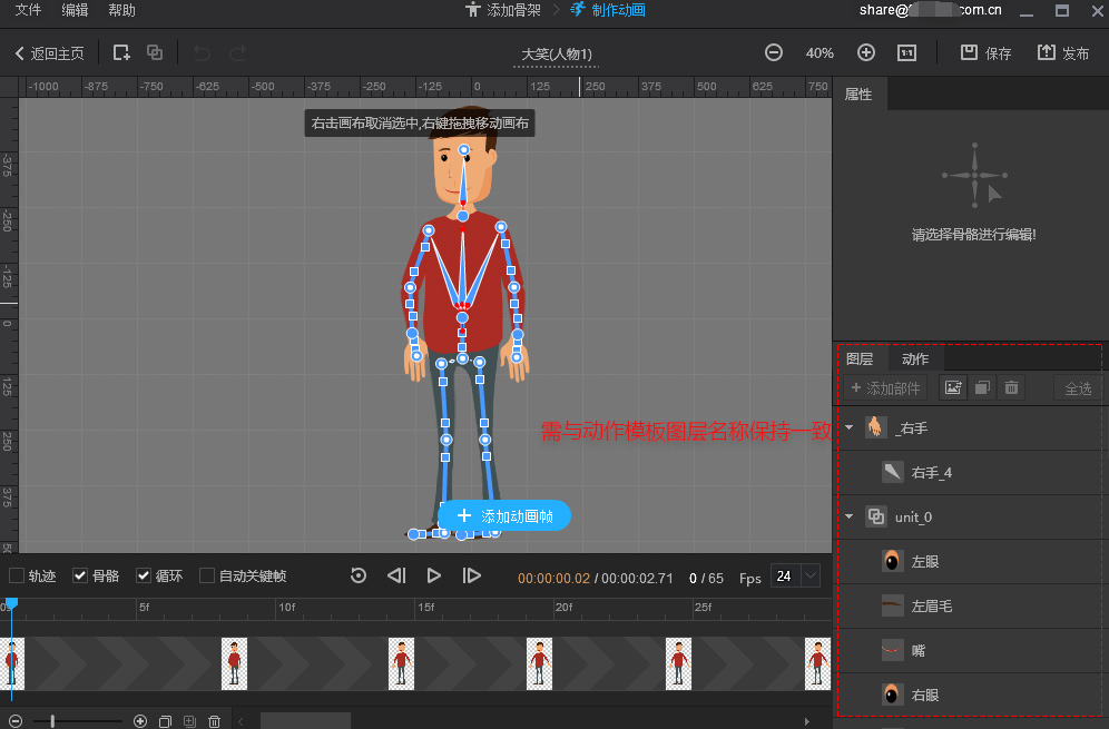進(jìn)入添加骨架操作界面,即可開(kāi)始給角色圖片添加骨頭。假如是想要實(shí)現(xiàn)更順滑的曲線運(yùn)動(dòng)效果,則可以選擇添加曲線骨頭。