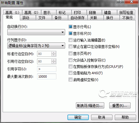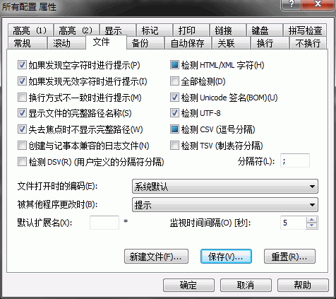 前面已經(jīng)知道,EmEditor有一個(gè)“所有配置屬性”。對(duì),它是用于配置所有文件格式共同的屬性。下面介紹常用配置。