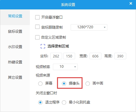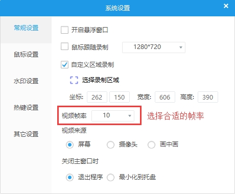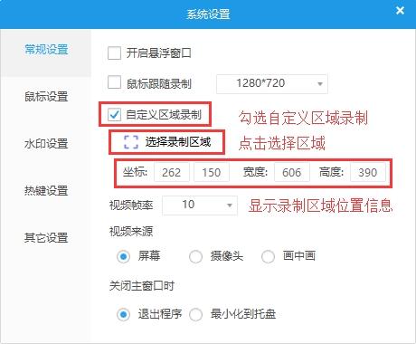 打開設(shè)置界面,點擊常規(guī)設(shè)置,勾選自定義區(qū)域錄制, 并且設(shè)置要錄制的區(qū)域