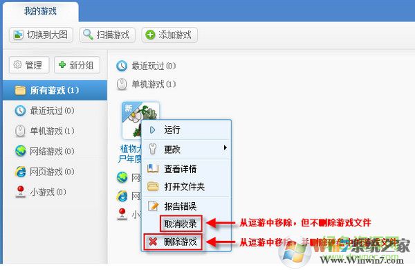 如果您想徹底刪除游戲,請?jiān)凇疚业挠螒颉恐杏益I點(diǎn)擊圖標(biāo)在菜單中選擇【刪除游戲】,如果您只是想從逗游【我的游戲】中移除該游戲請選擇【取消收錄】。
