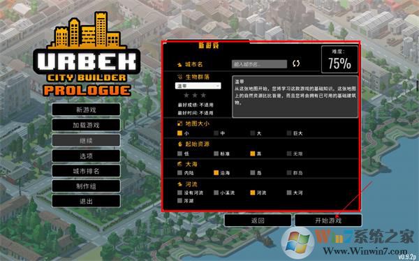 6、在此界面可以選擇地圖大小、起始資源、周邊環(huán)境等,點擊“開始游戲”進行建造之旅吧。