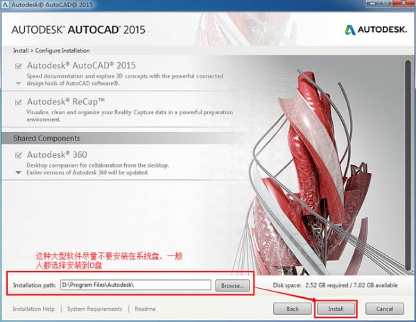 個(gè)人建議像CAD2015這類型的安裝軟件相對(duì)較大,希望不要安裝在系統(tǒng)盤(pán),找個(gè)空間稍大的盤(pán),設(shè)置好盤(pán)符就點(diǎn)擊安裝。 如圖五。