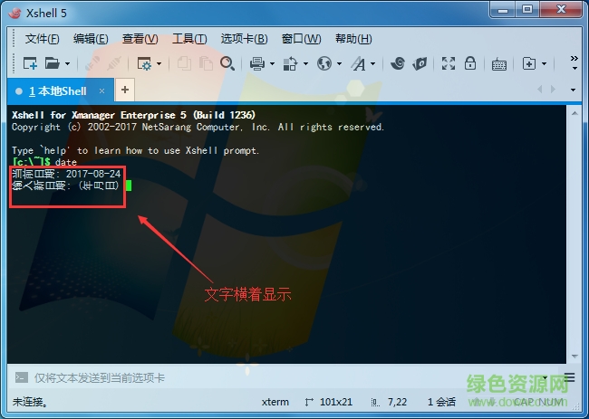 比如我們?cè)赬shell中輸入命令“date”,然后按回車(chē)鍵,會(huì)顯示當(dāng)前的具體日期,如下圖所示,可以看到中文是橫著顯示的。