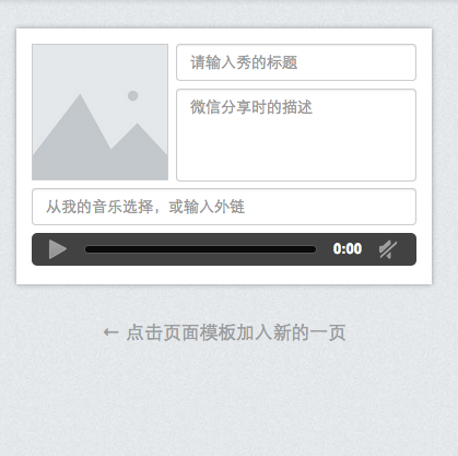 編輯區(qū)域,頂部設(shè)置封面,標(biāo)題,分享到微信時(shí)的描述,和調(diào)教音樂(lè)。添加頁(yè)面,可以點(diǎn)擊左側(cè)的頁(yè)面模板添加。