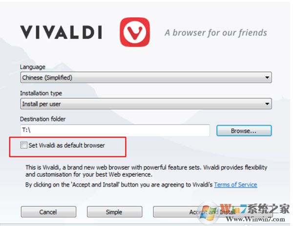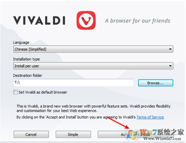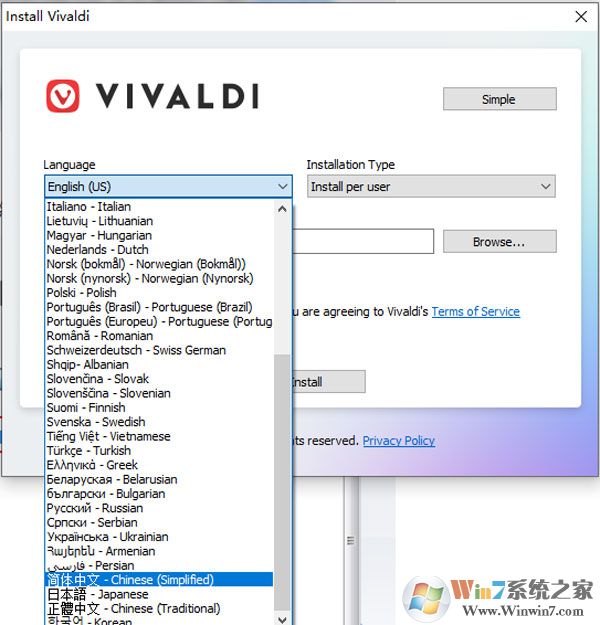 安裝界面Vivaldi瀏覽器的安裝支持自定義安裝目錄,支持英語(yǔ)、日語(yǔ)、法語(yǔ)、俄語(yǔ)等近10種語(yǔ)言。
