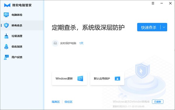 病毒查殺: 包含快速查殺、全盤查殺、自定義查殺、Windows 更新、默認應用保護等功能。