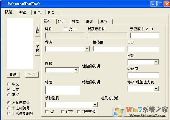 隊(duì)伍修改:包括基本的種族、性格、手持道具、等級(jí)、經(jīng)驗(yàn)、能力、技能、緞帶、寵物球等