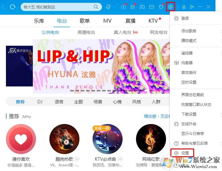 1、打開酷狗音樂界面,點擊右上角的“齒輪”,然后再點【設(shè)置】