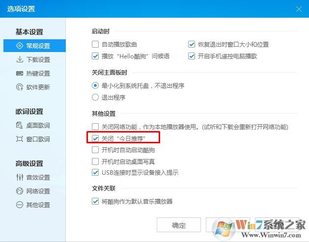 2、取消勾選“開機(jī)啟動酷狗”選項,確定即可;