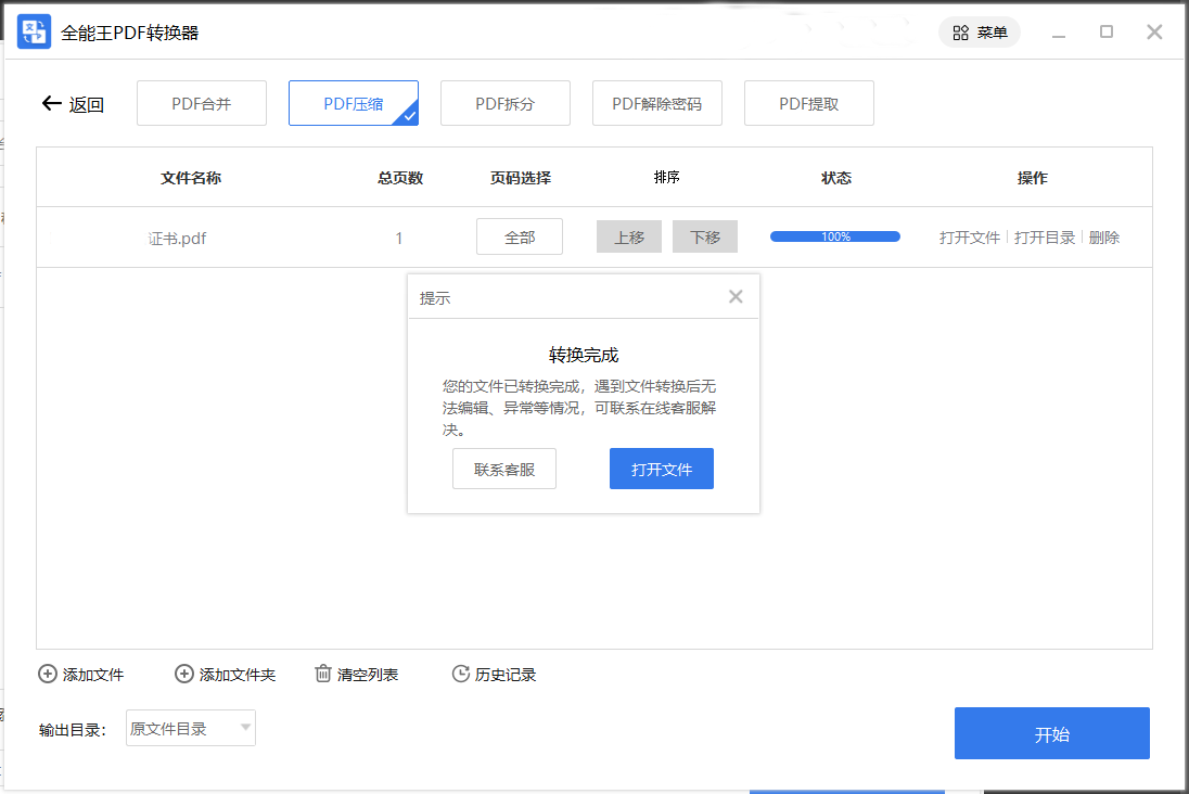 6、點擊開始之后進(jìn)行開始壓縮,之后在輸出目錄找到壓縮后的PDF文件即可。