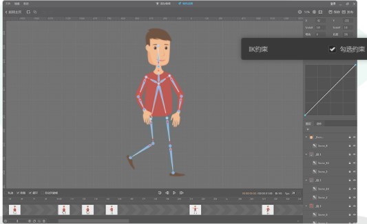 添加骨骼到圖片后,可以控制骨骼讓角色移動(dòng)、任意角度旋轉(zhuǎn)。其中曲線骨骼可以讓角色的曲線變化更加圓滑流暢,從而讓動(dòng)畫角色整體效果達(dá)到最佳。