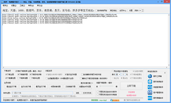 1、同時下載淘寶主圖視頻和描述的視頻。2、下載主圖、下載細節(jié)圖、下載手機詳情、下載屬性圖、下載其他圖、下載評論圖。