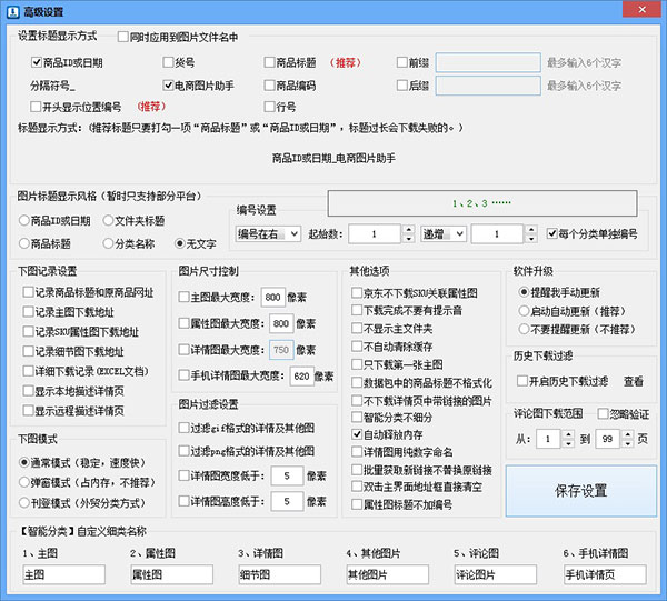 3、高級設(shè)置界面:在軟件左上角【設(shè)置】-【高級設(shè)置】,在這里可以設(shè)置文件夾名、圖片標題、圖片尺寸控制、下載記錄等。