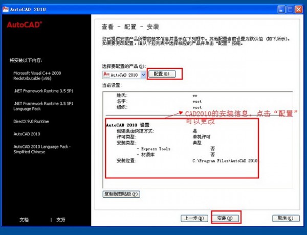 確認CAD2010的安裝信息后點擊“安裝”開始安裝CAD2010 32位中文版 點擊“配置”可以修改CAD2010的安裝信息 如圖七所示。