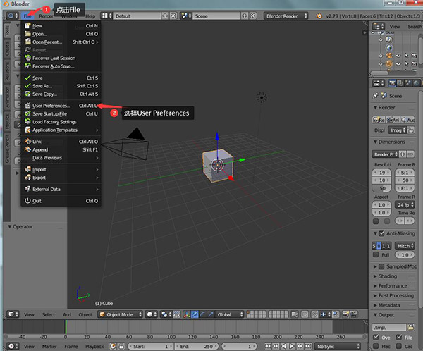 1、首先打開blender.exe應(yīng)用程序,進(jìn)入頁(yè)面后點(diǎn)擊File,選擇User Preferences;