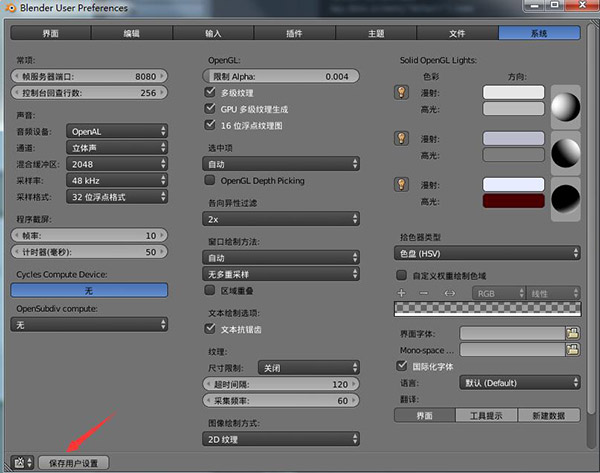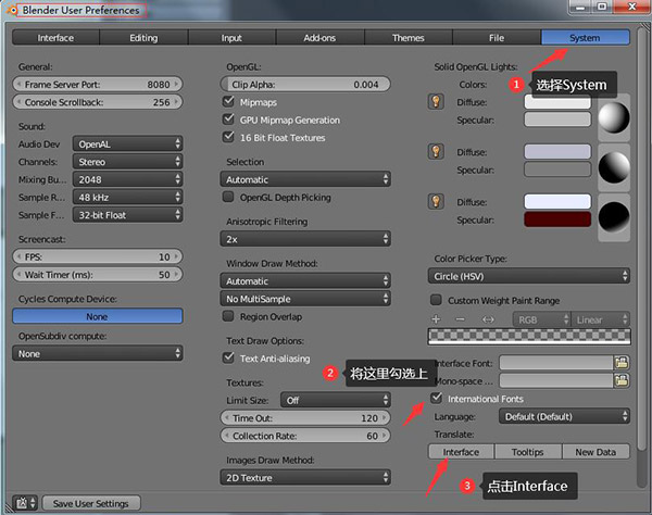 2、在彈出的窗口 “Blender User Preferences” 中選 System 選項(xiàng)卡,勾選 International Fonts在點(diǎn)擊Interface;