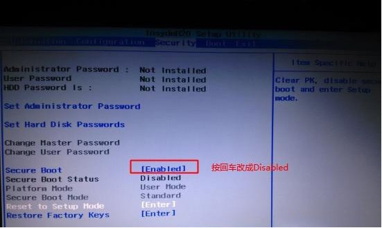 1、首先,開機一直按F2或(FN+F2)進入BIOS,在按→方向鍵切換到Security,在選擇Secure Boot回車設(shè)置成Disabled;